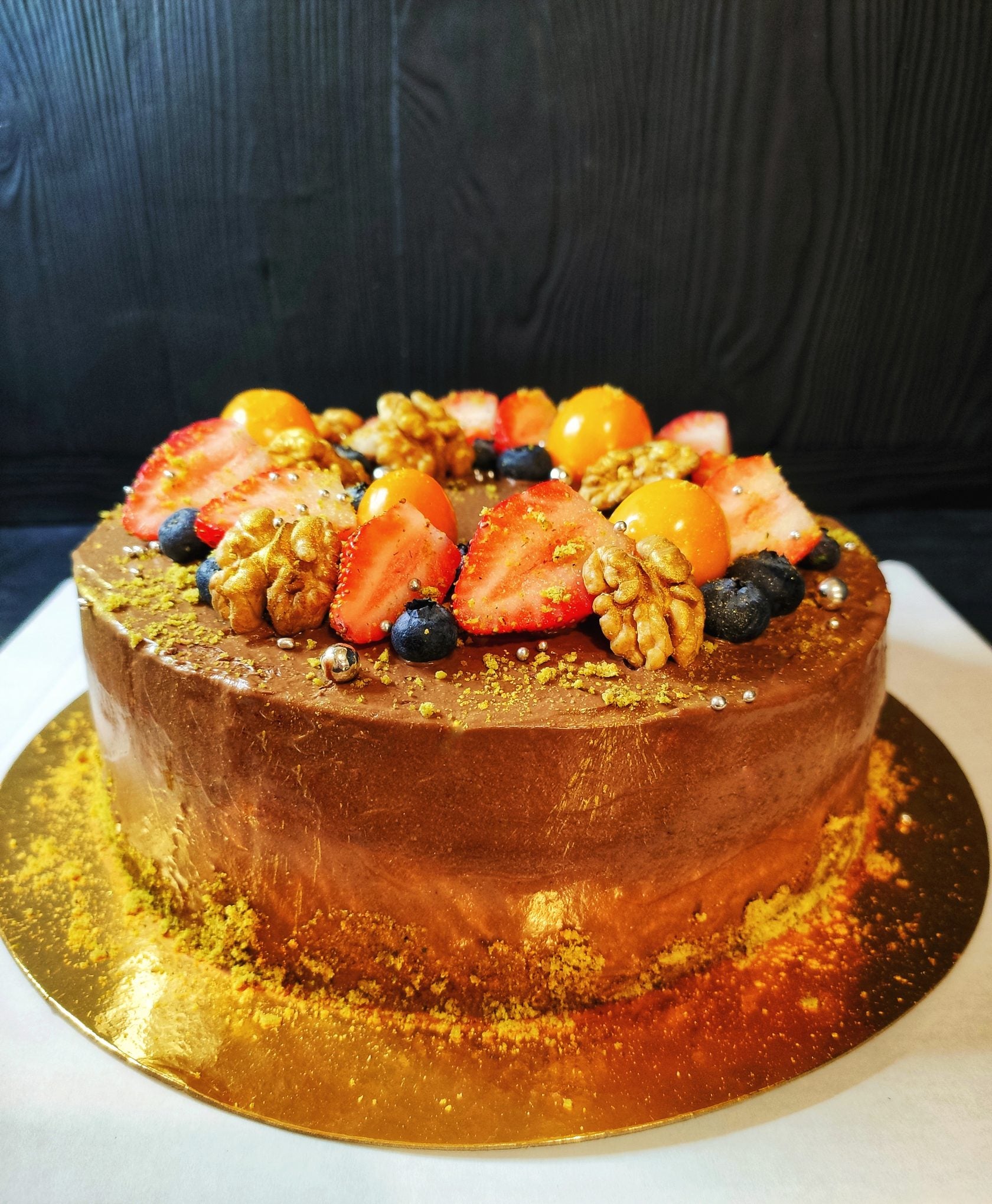The photo shows cakes with additional servings of berries. If the no-berries option is picked, the cake will only be covered in chocolate ganache.