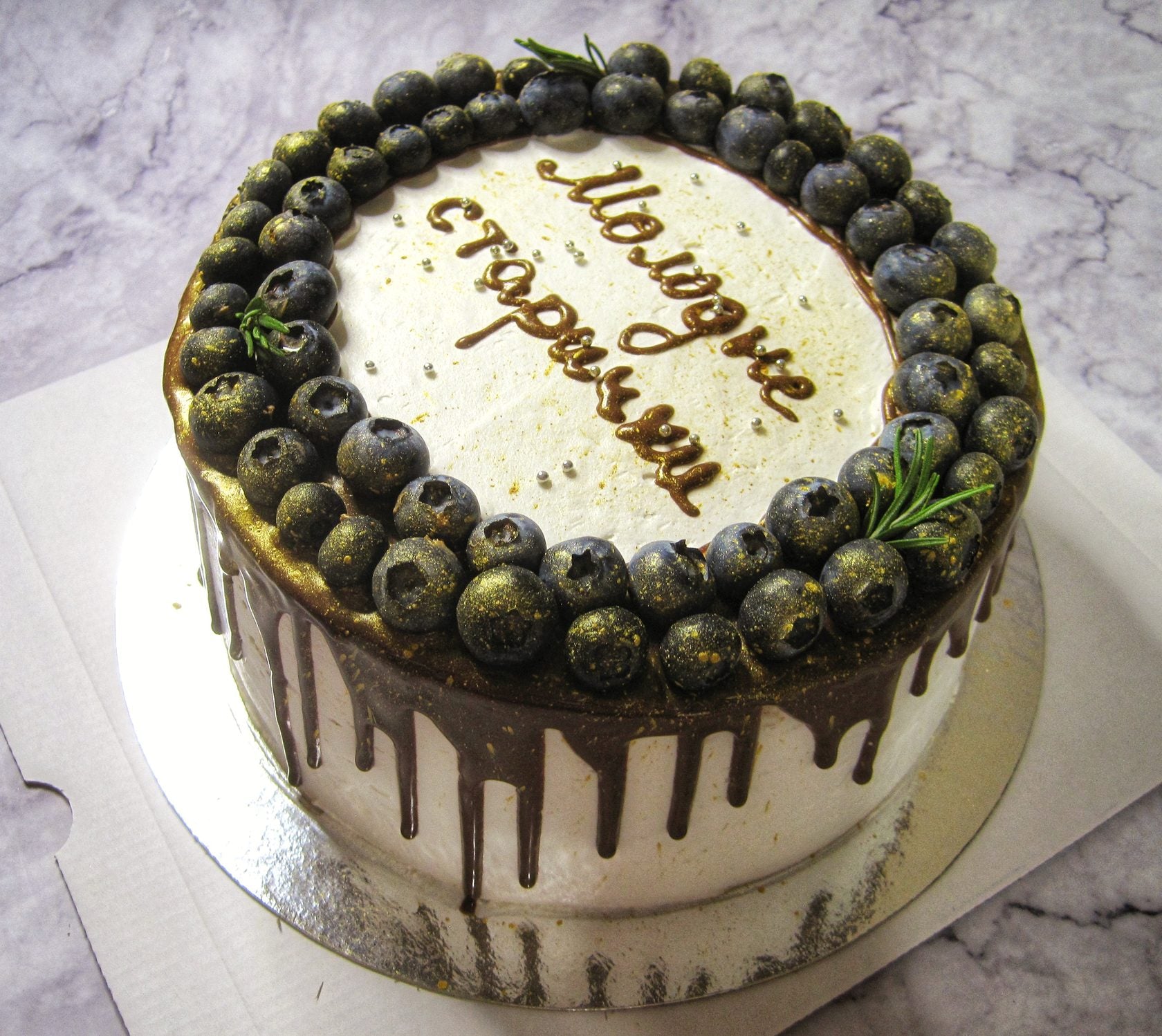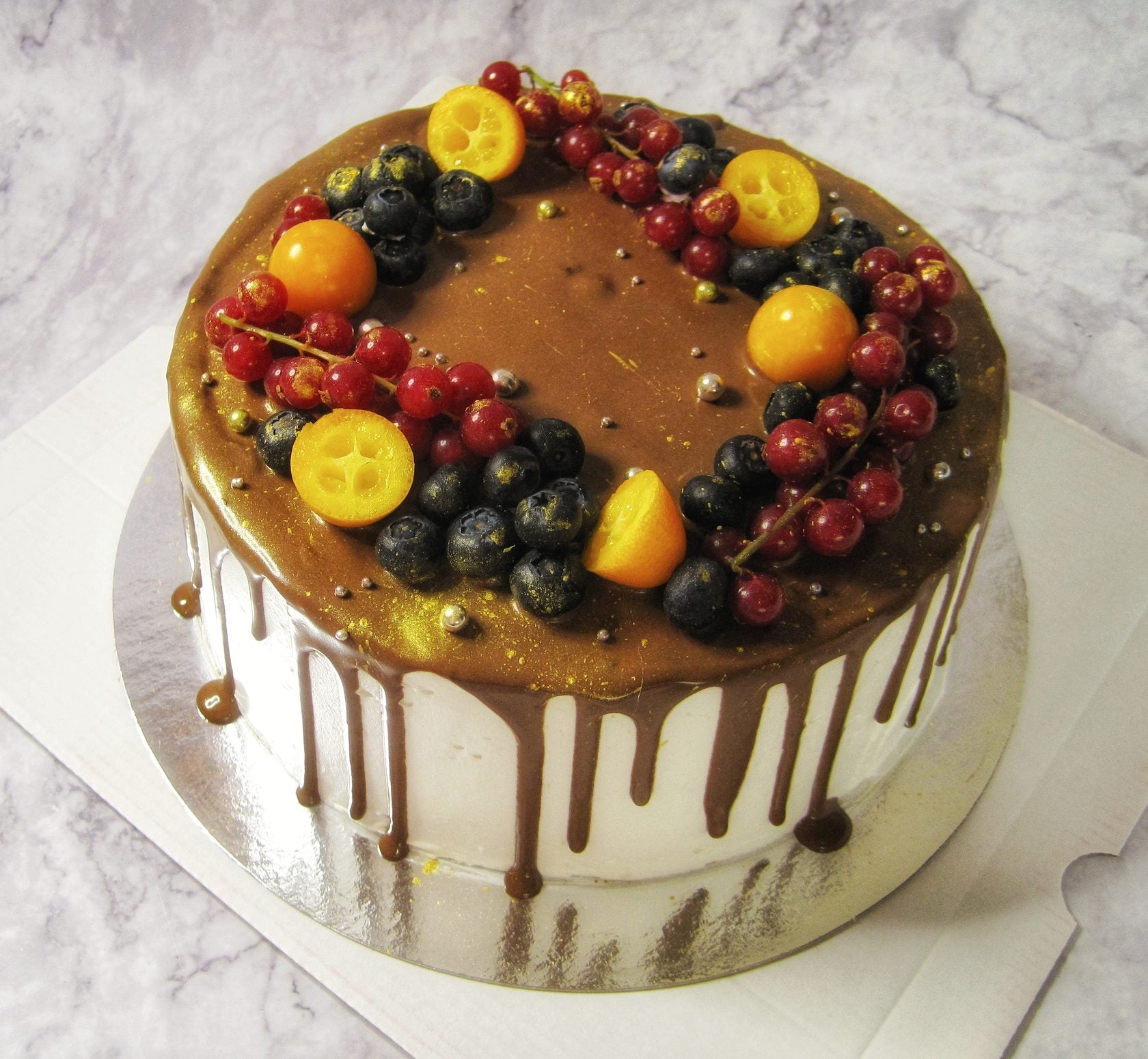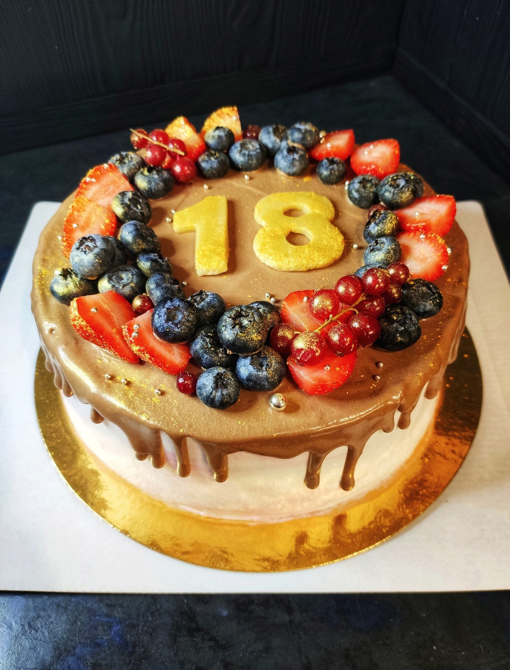 The photo shows cakes with additional servings of berries. If no berries are picked, the cake will only be covered in chocolate ganache. Writing/numbers on the cake is a free service.